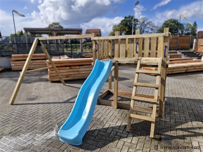 Vloerhoogte 125cm. Materiaal: palen & schommel 88x88mm, glijbaan kunststof kleur blauw, geleverd incl..2 st handvast-4 schommelhaken-1 st grond ankers voor palen van schommel te verankeren. geleverd incl. bevestigingsmateriaal en handleiding. Geleverd in een bouwpakket.