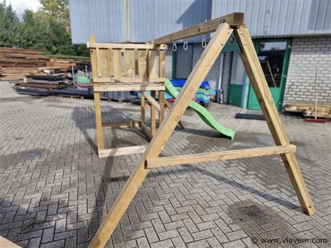 Vloerhoogte 125cm. Materiaal: palen & schommel 88x88mm, glijbaan kunststof kleur groen, geleverd incl..2 st handvast-4 schommelhaken-1 st grond ankers voor palen van schommel te verankeren. geleverd incl. bevestigingsmateriaal en handleiding. Geleverd in een bouwpakket.
