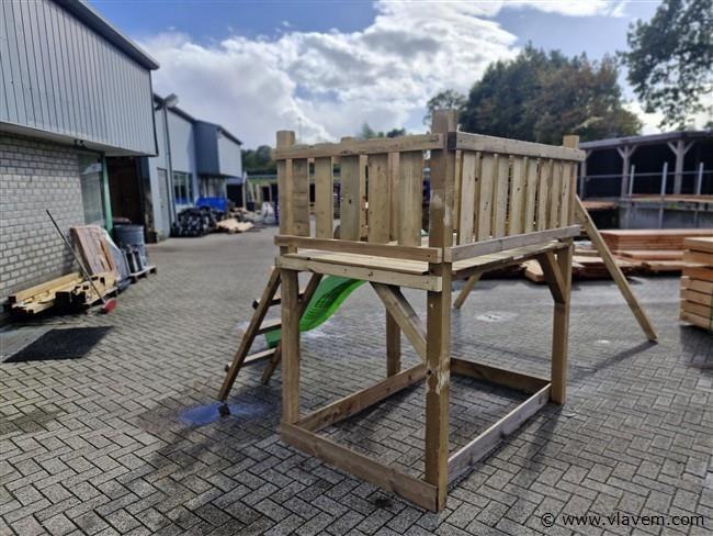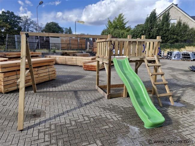 Vloerhoogte 125cm. Materiaal: palen & schommel 88x88mm, glijbaan kunststof kleur groen, geleverd incl..2 st handvast-4 schommelhaken-1 st grond ankers voor palen van schommel te verankeren. geleverd incl. bevestigingsmateriaal en handleiding. Geleverd in een bouwpakket.