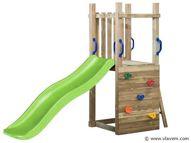 Speeltoren met glijbaan Platformhoogte: 90 cm. Appelgroene glijbaan van 175 cm (licht verkleurd). Inclusief 6 handgrepen en 4 klimstenen