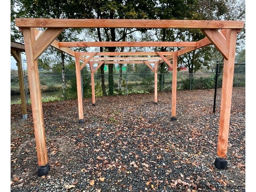 Carport/overkapping 310x1500x285cm BxDxHcm Materiaal: . 12 st. Palen 10x10cm douglas Ligger45x145cm Dakbalken45x145cm redwood Carport word geleverd in een bouwpakkeet met hand leiding en bevestigngs materiaal ( paal houders niet in begrepen)