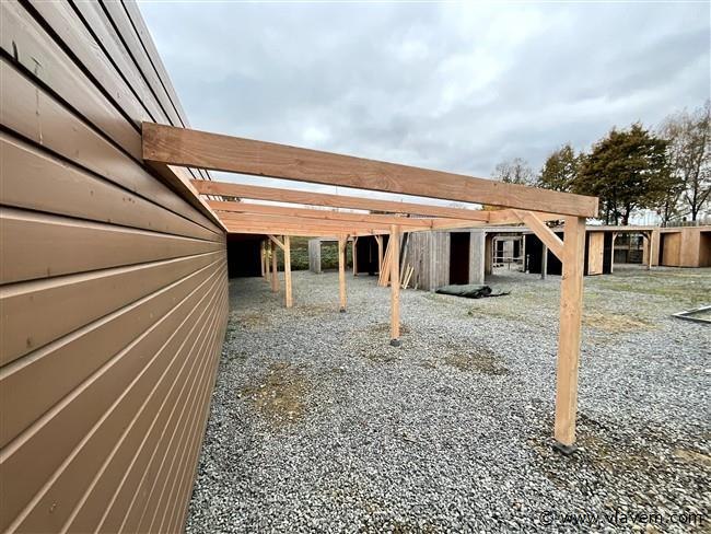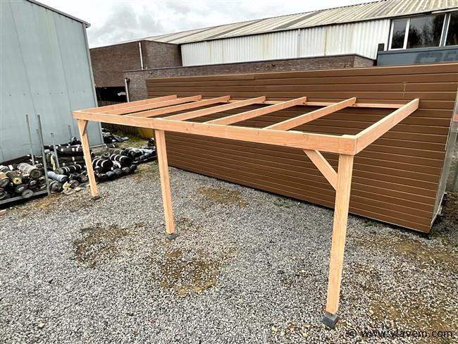 Carport/overkapping 310x900x185/225cm BxDxHcm Materiaal: .4 st. Palen 10x10cm douglas Ligger45x145cm Dakbalken45x145cm redwood Carport word geleverd in een bouwpakkeet met hand leiding en bevestigngs materiaal ( paal houders niet in begrepen)