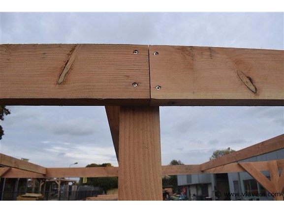 Carport/overkapping 310x900x185/225cm BxDxHcm Materiaal: .8 st. Palen 10x10cm douglas Ligger45x145cm Dakbalken45x145cm redwood wanden zwart geimperneerd zweeds rabat Carport word geleverd in een bouwpakkeet met hand leiding en bevestigngs materiaal ( paal houders niet in begrepen)