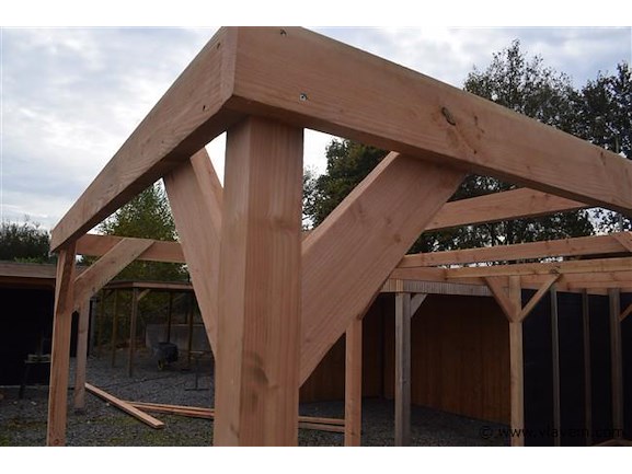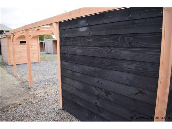 Carport/overkapping 310x900x185/225cm BxDxHcm Materiaal: .8 st. Palen 10x10cm douglas Ligger45x145cm Dakbalken45x145cm redwood wanden zwart geimperneerd zweeds rabat Carport word geleverd in een bouwpakkeet met hand leiding en bevestigngs materiaal ( paal houders niet in begrepen)