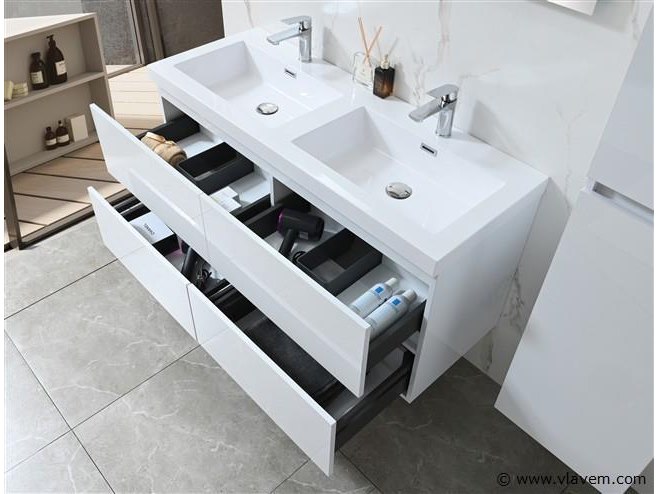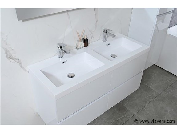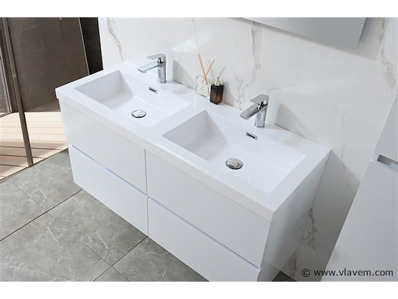 Aantal:1 Merk:Vonato Productnaam:Badkamermeubel 2 persoons Type:9015W Model:3-delig met dubbele wasbak Kleur:Hoogglans wit, witte wastafel Materiaal:Melamine, kunstmarmeren wastafel Afmeting:3-delige set: 1 * Wastafelmeubel - 1200x450x600mm 1 * Zijkast - 1500x350x350mm 1 * Spiegel - 1200x600mm Voorzien van:Kranen inclusief pop-up afvoer – 4 stevige metalen lades - Softclose lade systeem - LED spiegel met anti-fog systeem - Voorgemonteerde zijkast en wastafelmeubel Conditie:Nieuw
