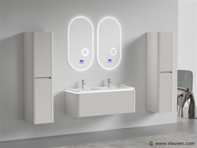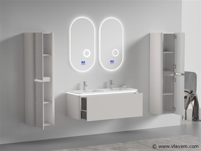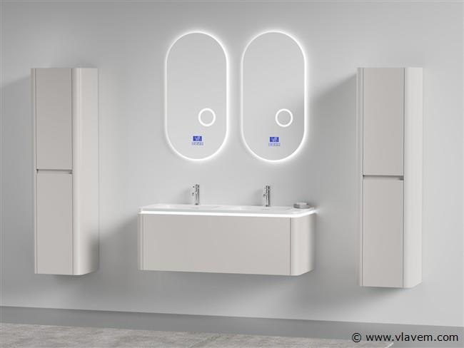 Aantal:1 Merk:Vonato Type:BOSTON1202-TA Model:Badkamermeubel 2 persoons 120 cm Kranen:Incl. 2 kranen Materiaal:Melamine en MDF Afmetingen Complete set: 1 * Wastafelmeubel - 1200x455x400mm 1 * Dubbele wasbak - 1205x460x190mm 2 * Zijkast - 1500x350x350mm 2 * Spiegel - 450x900mm Kleur:Taupe Voorzien van:LED verlichting in onderkast - 2 kranen inclusief pop-up afvoer – 1 lade met 2 opbergvakken - Softclose lade systeem – 2 LED spiegels met anti-fog systeem - Voorgemonteerde zijkasten en wastafelmeubel Conditie:Nieuw