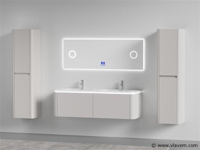 Aantal:1 Merk:Vonato Type:BOSTON1401-TA Model:Badkamermeubel 2 persoons 140 cm Kranen:Incl. 2 kranen Materiaal:Melamine en MDF Afmetingen Complete set: 1 * Wastafelmeubel - 1400x455x400mm 1 * Dubbele wasbak - 1405x460x190mm 2 * Zijkast - 1500x350x350mm 1 * Spiegel - 1400x600mm Kleur:Taupe Voorzien van:LED verlichting in onderkast - 2 kranen inclusief pop-up afvoer – 2 lades - Softclose lade systeem - LED spiegel met anti-fog systeem - Voorgemonteerde zijkasten en wastafelmeubel Conditie:Nieuw