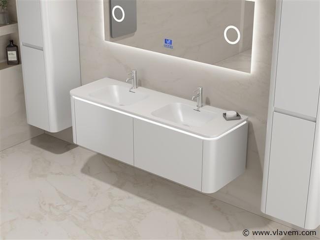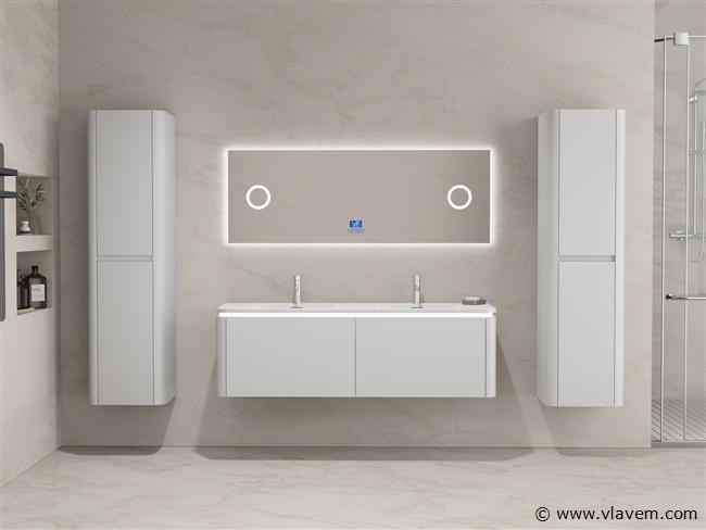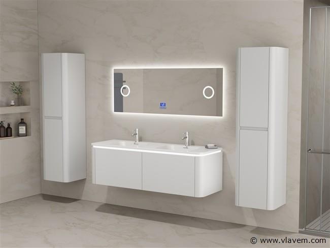 Aantal:1 Merk:Vonato Type:BOSTON1401-WH Model:Badkamermeubel 2 persoons 140 cm Kranen:Incl. 2 kranen Materiaal:Melamine en MDF Afmetingen Complete set: 1 * Wastafelmeubel - 1400x455x400mm 1 * Dubbele wasbak - 1405x460x190mm 2 * Zijkast - 1500x350x350mm 1 * Spiegel - 1400x600mm Kleur:Taupe Voorzien van:LED verlichting in onderkast - 2 kranen inclusief pop-up afvoer – 2 lades - Softclose lade systeem - LED spiegel met anti-fog systeem - Voorgemonteerde zijkasten en wastafelmeubel Conditie:Nieuw