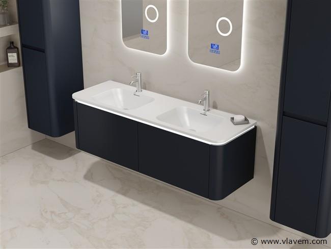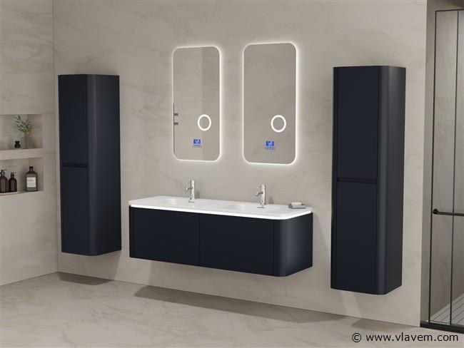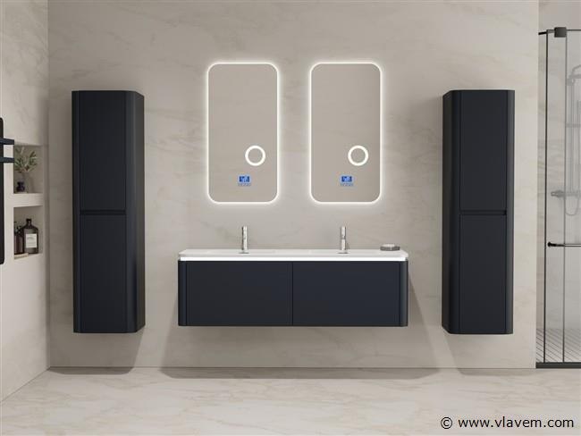 Aantal:1 Merk:Vonato Type:BOSTON1402-BL Model:Badkamermeubel 2 persoons 140 cm Kranen:Incl. 2 kranen Materiaal:Melamine en MDF Afmetingen Complete set: 1 * Wastafelmeubel - 1400x455x400mm 1 * Dubbele wasbak - 1405x460x190mm 2 * Zijkast - 1500x350x350mm 2 * Spiegel - 450x900mm Kleur:Zwart Voorzien van:LED verlichting in onderkast - 2 kranen inclusief pop-up afvoer – 2 lades - Softclose lade systeem – 2 LED spiegels met anti-fog systeem - Voorgemonteerde zijkasten en wastafelmeubel Conditie:Nieuw