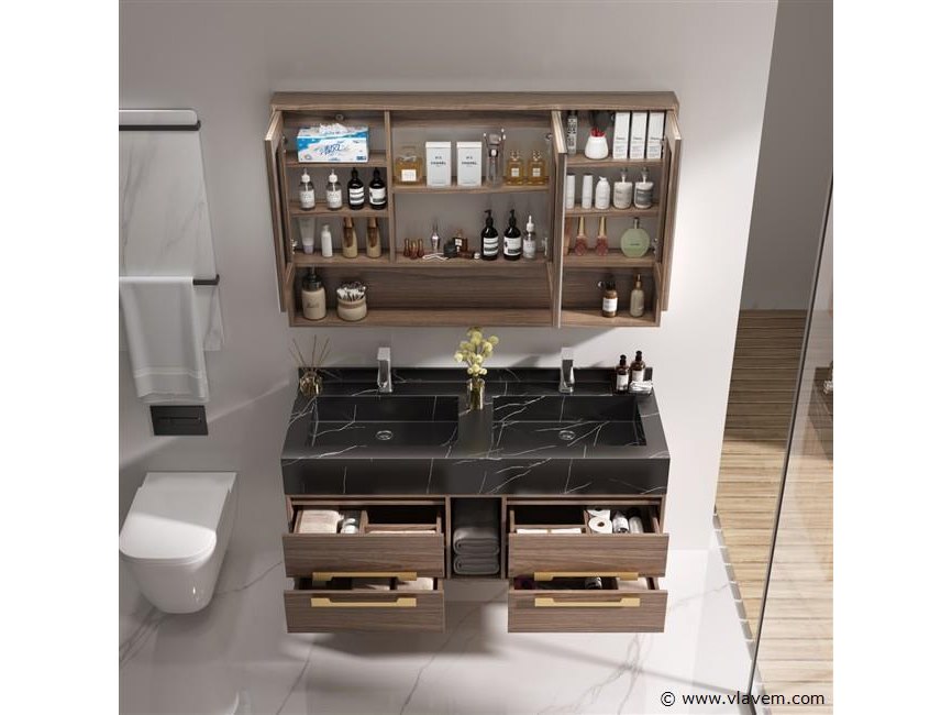 Aantal:1 Merk:Vonato Productnaam:Badkamermeubel Type:MBY-312 Model:2-persoons badkamermeubel 120 cm donker hout decor met marmeren wasbak Kranen:Inclusief 2 opzetkranen Materiaal: Meubel: Multiplex met melamine, Wasbak: Marmer Afmetingen 2 persoons set: 1 x Wastafelmeubel - 1200x550x550mm 1 x Spiegel - ca. 1200x700mm Kleur:Donker hout decor, zwarte wasbak Voorzien van:Softclose lade systeem: 4 lades - Kranen inclusief pop-up afvoer - Spiegel met touchscreen LED-verlichting en anti-fog technologie - Opbergruimte in de spiegel - Voorgemonteerd wastafelmeubel. Conditie: Nieuw Ter waarde van: € 2195,00