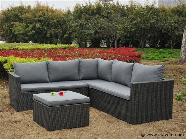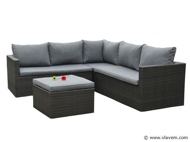 Aantal:1 Merk:Vonato Productnaam:Loungeset Type:IBIZA Model:Hoek, 4-delig Frame:Aluminium frame Kleur:Antraciet wicker + grijze kussens Afmetingen:4-delige set: 2 * bank: 138x73x64 cm 1 * hoekstuk: 73x73x64 cm 1 * hocker/tafel: 73x73x36 cm Zithoogte:36 cm Voorzien van:Waterafstotende kussens 8 cm dik - weerbestendig vlechtwerk – Gepoedercoat aluminium frame Conditie:Nieuw