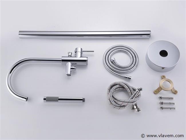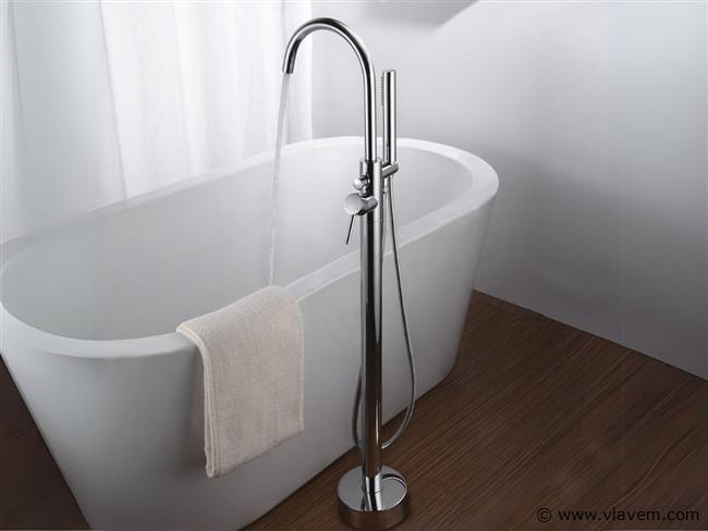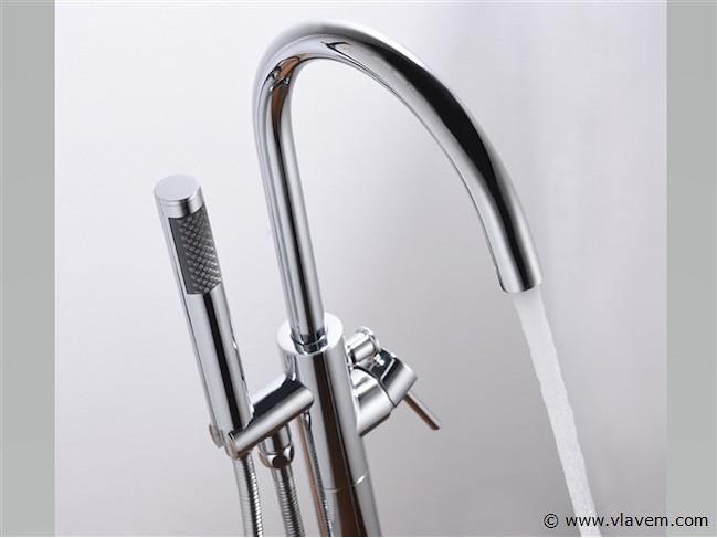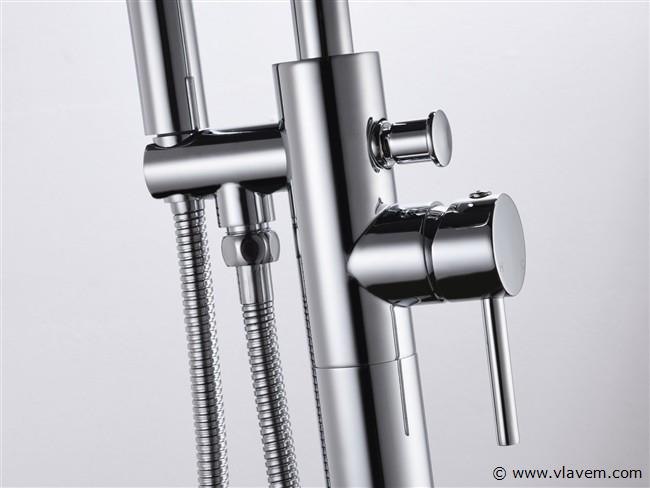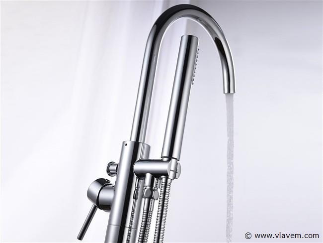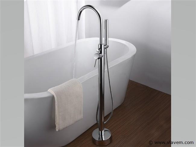 Aantal:1 Merk: Vonato Productnaam:Vrijstaande badkraan Type: FAUCET CHROME Model:Vrijstaand Kleur:Zilver (chroom) Afmetingen: De kraan is 111 cm hoog en de breedte is ca. 25 cm. Voorzien van: Uitneembare handdouche - Buis, handdouche en beugel van messing - 360 graden draaibare uitloop Conditie: Nieuw Ter waarde van: € 795,00
