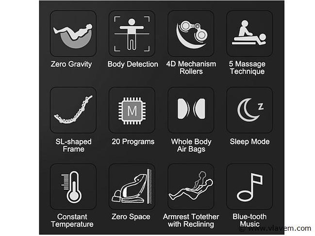 Aantal:1 Merk:Vonato Productnaam:Massagestoel Type:MAS-B6 Model:Zero Gravity Gewicht:95 Kg. Afmeting:1 Karton: 1330x730x1070mm Bekleding:Hoge kwaliteit leder Stroom:AC 100-240V - 150w Voorzien van: Zes 4D-mechanisme massage rollers in dubbele-S + L vorm - Bodyshape detectie - Verwarming - Bluetooth voorbereiding - Trilling - Afstandsbediening. Garantie: 1 jaar Conditie: Nieuw Ter waarde van: € 3.950,00