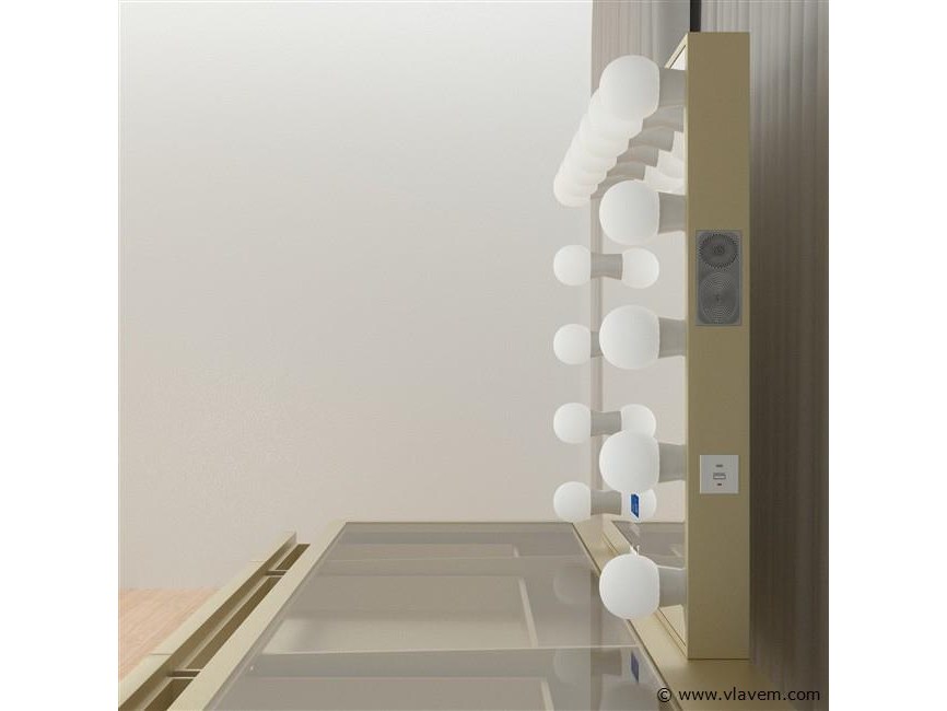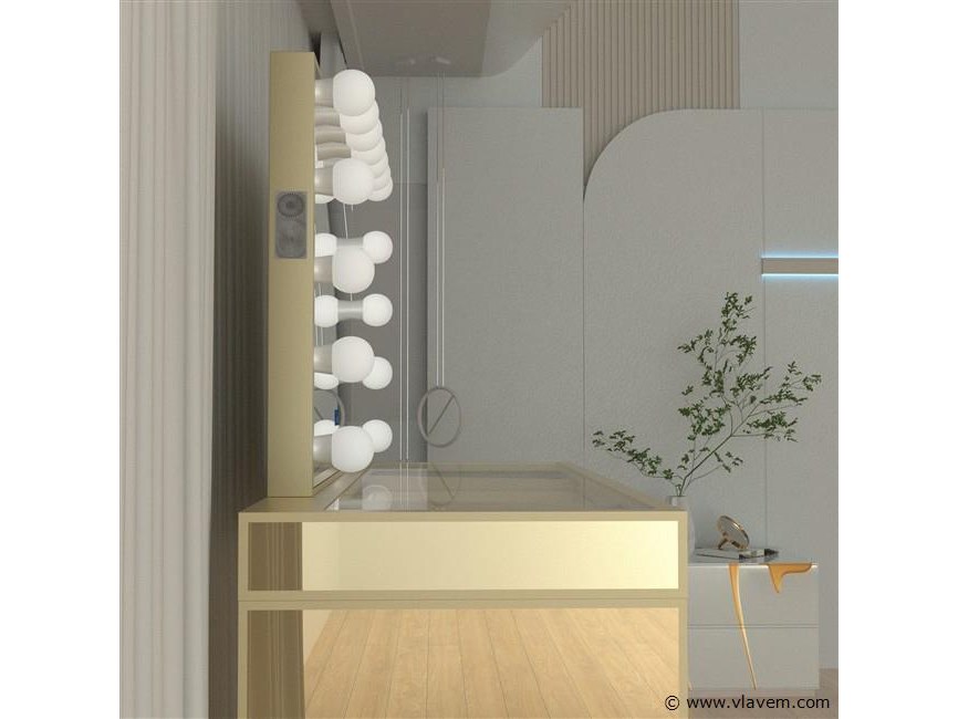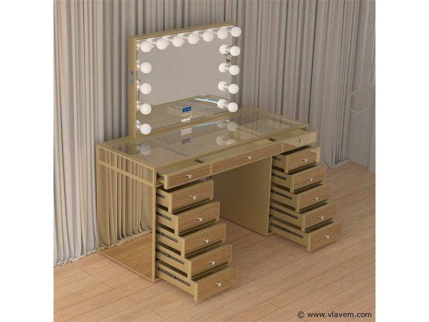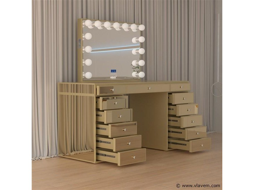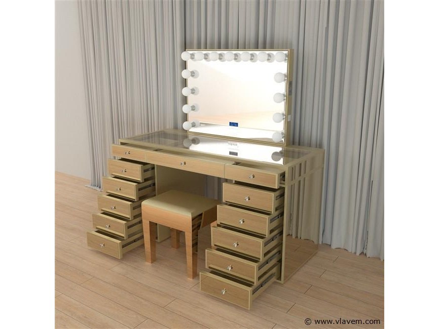 Aantal:1 Merk:Vonato Productnaam:Kaptafel Type:LG010-CG Model:Kaptafel met spiegel en kruk Kleur:Hoogglans goud Verlichting:15 stuks, 12V Materiaal:Geverfd MDF, gehard glazen blad Afmeting:complete set: 1 * Tafel: 1500x600x810mm 1 * Spiegel: 1000x800mm 1 * Kruk: 350x400mm Voorzien van: Verlichting met 3 standen – Touchbuttons – USB en type C aansluitingen – Muziek luisteren via Bluetooth functie - Helder gehard glazen tafelblad – 13 lades. Conditie:Nieuw