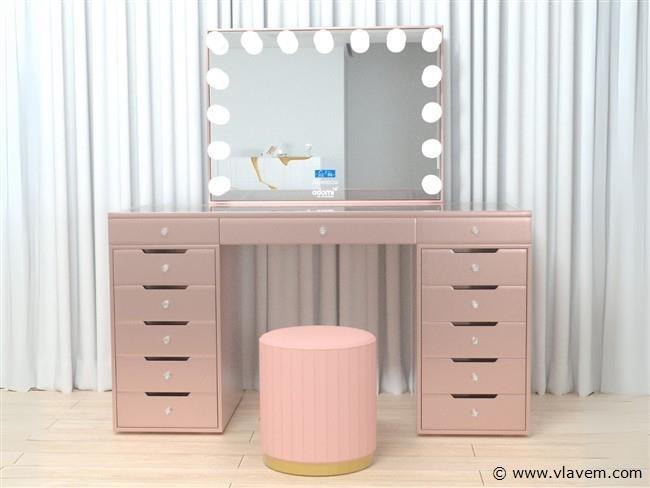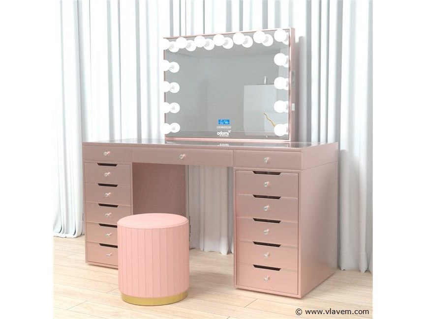 Aantal:1 Merk:Vonato Productnaam:Kaptafel Type:LG02-RG Model:Kaptafel met spiegel en kruk Kleur:Roze Verlichting:15 stuks, 12V Materiaal:Geverfd MDF, gehard glazen blad Afmeting:complete set: 1 * Tafel: 1500x600x810mm 1 * Spiegel: 1000x800mm 1 * Kruk: 350x400mm Voorzien van: Verlichting met 3 standen – Touchbuttons – USB en type C aansluitingen – Muziek luisteren via Bluetooth functie - Helder gehard glazen tafelblad – 13 lades. Conditie:Nieuw
