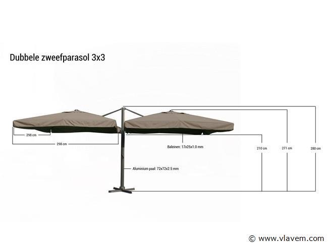 Aantal: 1 Merk: Paralux Productnaam:Parasol Type: U1073 DOUBLE 3X3 BLACK LUX Afmeting:3000x3000mm Model:Dubbel hangend Kleur: Donkergrijs Materiaal:Aluminium frame, 300 gram/m2 brandvertragend doek Productbeschrijving: De parasol is ideaal voor gebruik in de tuin, terras en balkon. De grote parasol wordt geleverd met een parasolvoet. Deze moet wel worden verzwaard met behulp van bijvoorbeeld terrastegels. Houd hiervoor minimaal een gewicht van 100 kilo aan. Voorzien van:Groot parasoldoek met een afmeting van 2x ø300 cm - UV-bescherming van 50+ - Kleurvast doek - Vuil- en waterafstotend door de PU-coating - Sterk en stevig frame gemaakt van aluminium. - Eenvoudig startklaar te zetten voor gebruik. - Inclusief parasolvoet. - Brandvertragend, dik doek - De parasol houdt de warmte van de zon vast waardoor het ook ’s avonds nog lekker warm is wanneer de zon ondergaat. - De parasol kan 360 graden om zijn as draaien, zo kan de parasol makkelijk meedraaien met de zon en maak je optimaal gebruik van de parasol. Conditie: Nieuw Ter waarde van:€ 1.495,00