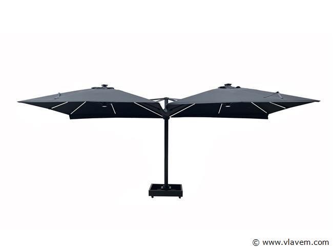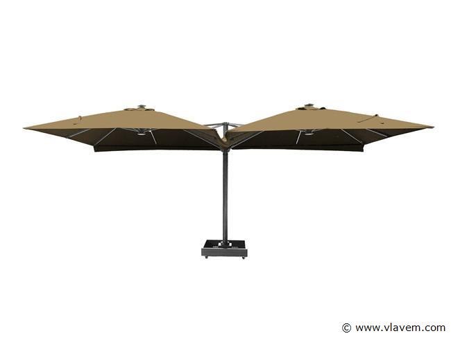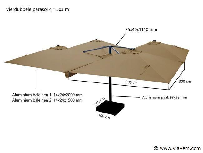 Aantal: 1 Merk: Vonato Productnaam: Parasol Type: U1075 QUATRE 3X3 TAUPE Afmeting: 4x 3000x3000mm Model: Vierdubbel hangend Kleur: Taupe Materiaal: Aluminium frame, 200 gram/m2 brandvertragend doek Productbeschrijving: De parasol is ideaal voor gebruik in de horeca en/of op een groot terras, tuin of binnenplaats. De parasol bestaat uit 4 parasols aan een frame en is voorzien van een grondanker. Exclusief verrijdbare parasolvoet: deze is los verkrijgbaar. Voorzien van: LED-verlichting onder het doek zodat het 's avonds ook nog goed vertoeven is onder de parasol. - Groot parasoldoek, 4 stuks, met een afmeting van ø300 cm. - Sterk en stevig frame gemaakt van aluminium. - Eenvoudig startklaar te zetten voor gebruik. - Brandvertragend, dik doek voor een betere UV-bescherming. - Ventilatie aan de bovenzijde van het doek. - De parasols zijn voorzien van een afritsbaar tussenstuk om de parasols te verbinden, zodat u altijd droog zit. Conditie: Nieuw Ter waarde van: € 4.495,00
