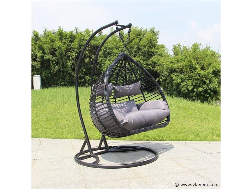 Hangstoel dubbel: 2 persoons 135 cm breed - hoogte 197 cm - zwart frame / grijze kussens