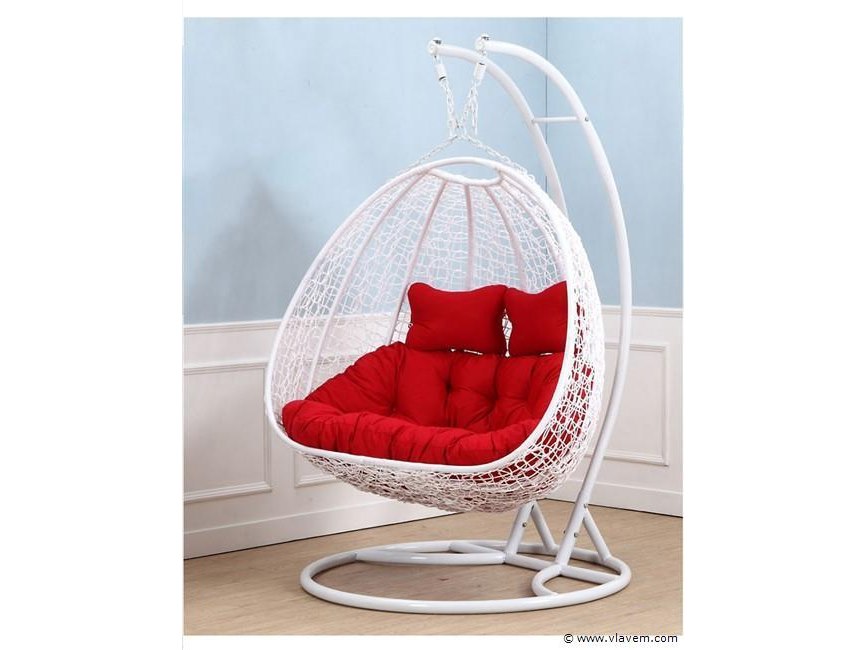 Hangstoel dubbel: 2 persoons 130 cm breed -hoogte 200 cm - wit frame / rode kussens